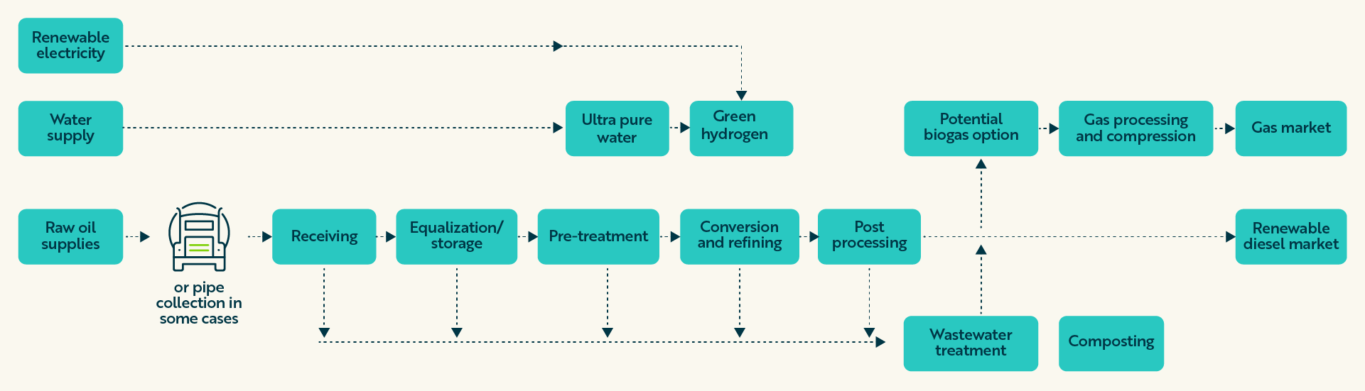 The diagram below shows an example of a renewable diesel production sequence including wastewater treatment and RNG production. The renewable (green) hydrogen included in the refining sequence would likely require demineralized water for its production.